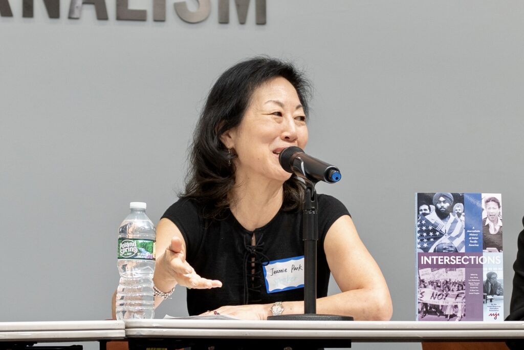 Photo of Jeannie Park, speaking at “Intersections” Book Panel at CUNY J School, hosted by AAJA NY/AAJA