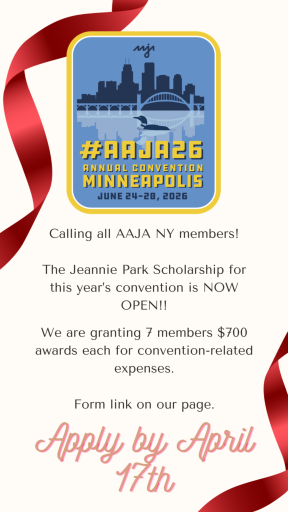 In honor of AAJA New York chapter co-founder Jeannie Park, we’re offering scholarships to chapter members to attend AAJA’s National Convention in Minneapolis this year. The grants, each $700, will help cover flights, convention registration and hotel costs for seven members. The deadline to complete this application is April 17 2026, and awardees will be announced around May 1. (You will need to have an active AAJA NY membership to be considered)